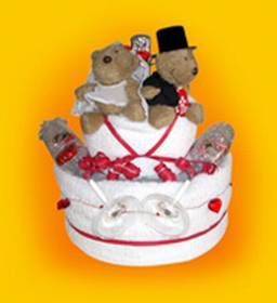 Bestehend aus 2 Duschtüchern, 2 Handtüchern, 2 Leonardo-Sektgläsern, einer Flasche Sekt, Pralinen und einem Plüschbären-Hochzeitspaar